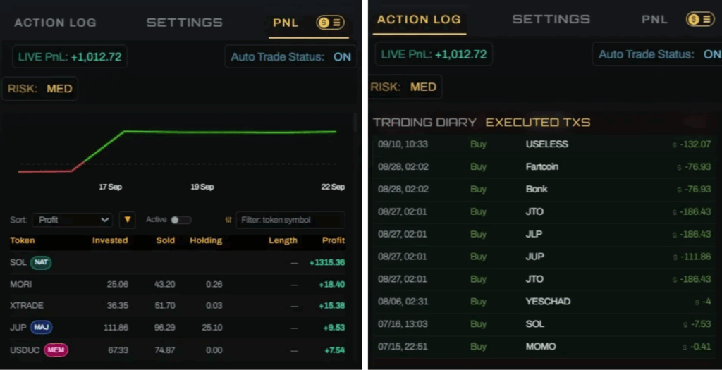 Once we set our parameters, Milo handled discovery, entries, exits, and rebalancing without requiring constant attention. Each trade is logged in accessible language, explaining the rationale behind every move.