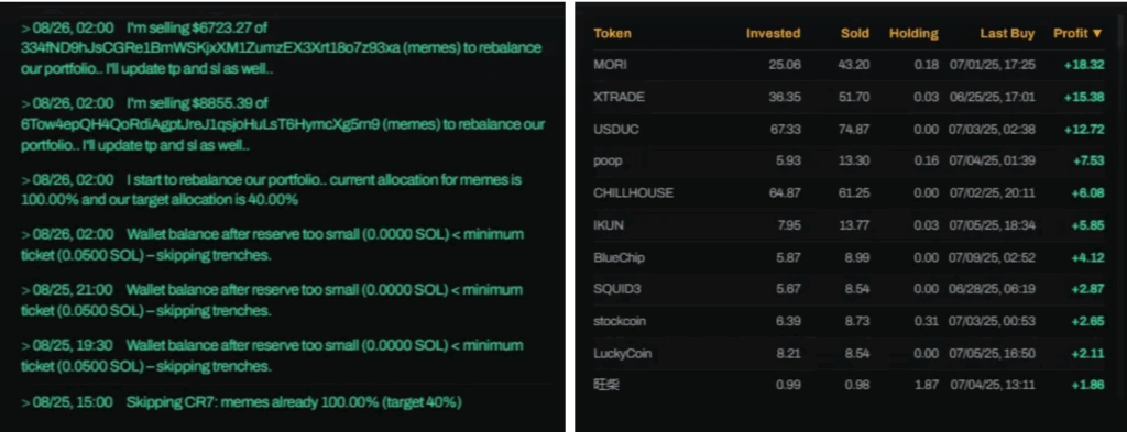 The portfolio included top performers such as Useless Coin, Fartcoin, Bonk, JLP, JTO, JUP, and SOL; a diverse mix of memecoins and major Solana tokens. While Milo occasionally made suboptimal trades, the majority contributed positively to the portfolio.